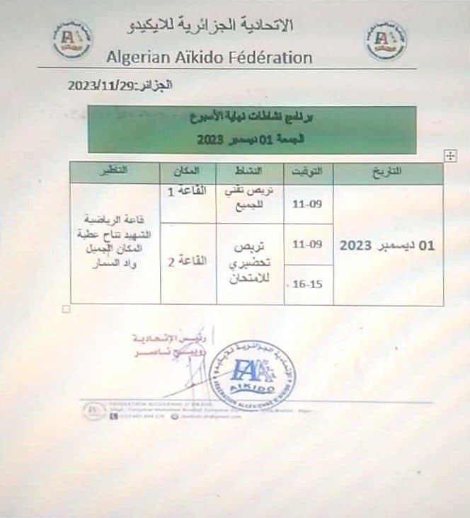 مشاركة فرع الايكيدو لنادي المنار في التربص التقني والتحضيري لامتحان الايكيكاي يوم الجمعة1ديسمبر2023 بقاعة الحي الجميل بواد السمار من تنظيم الاتحادية الجزائرية للايكيدو وتحت اشراف الخبيرين رويبح ناصر حزام اسود درجة سابعة والخبير عوير عبدالقادر حزام اسود درجة سادسة.